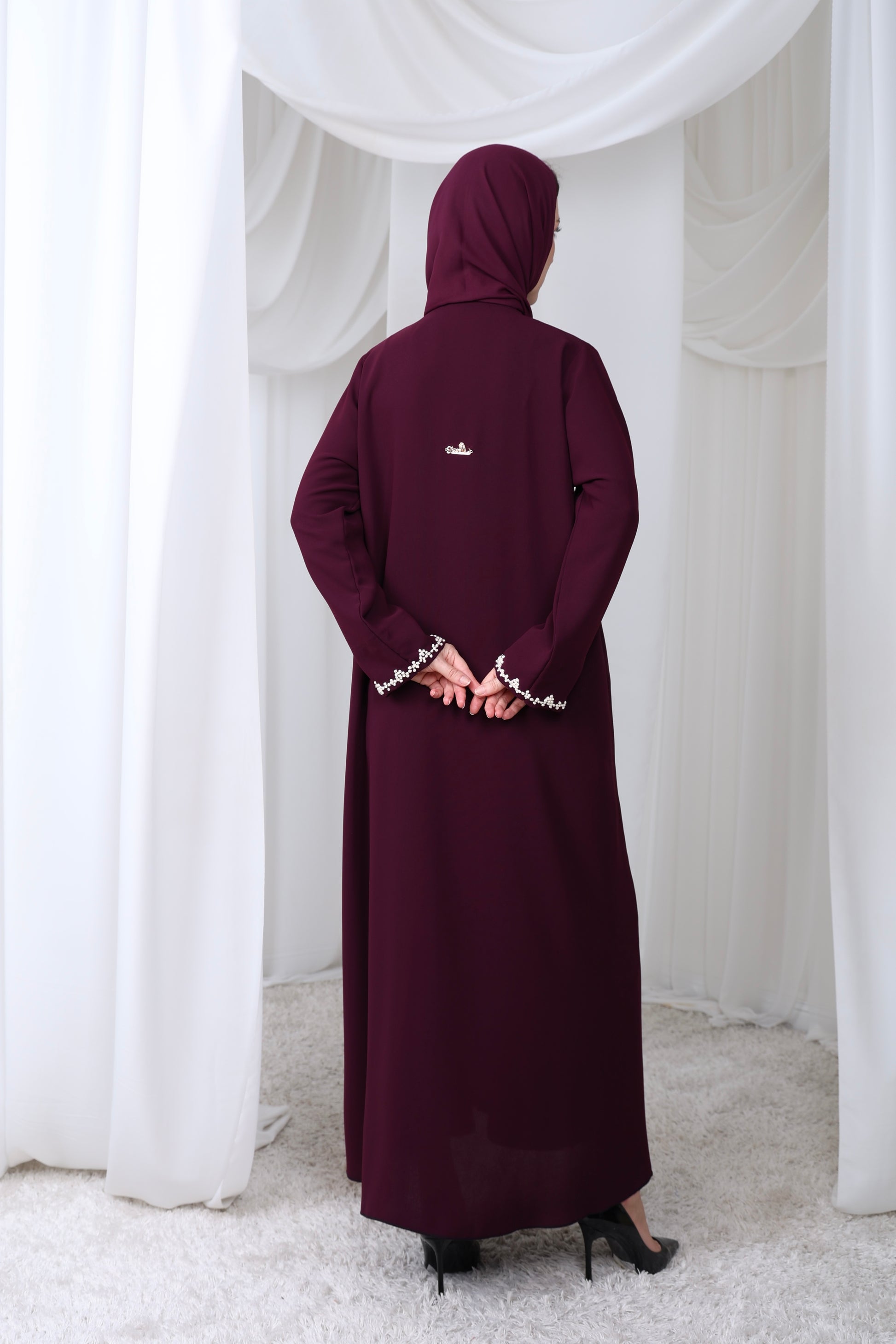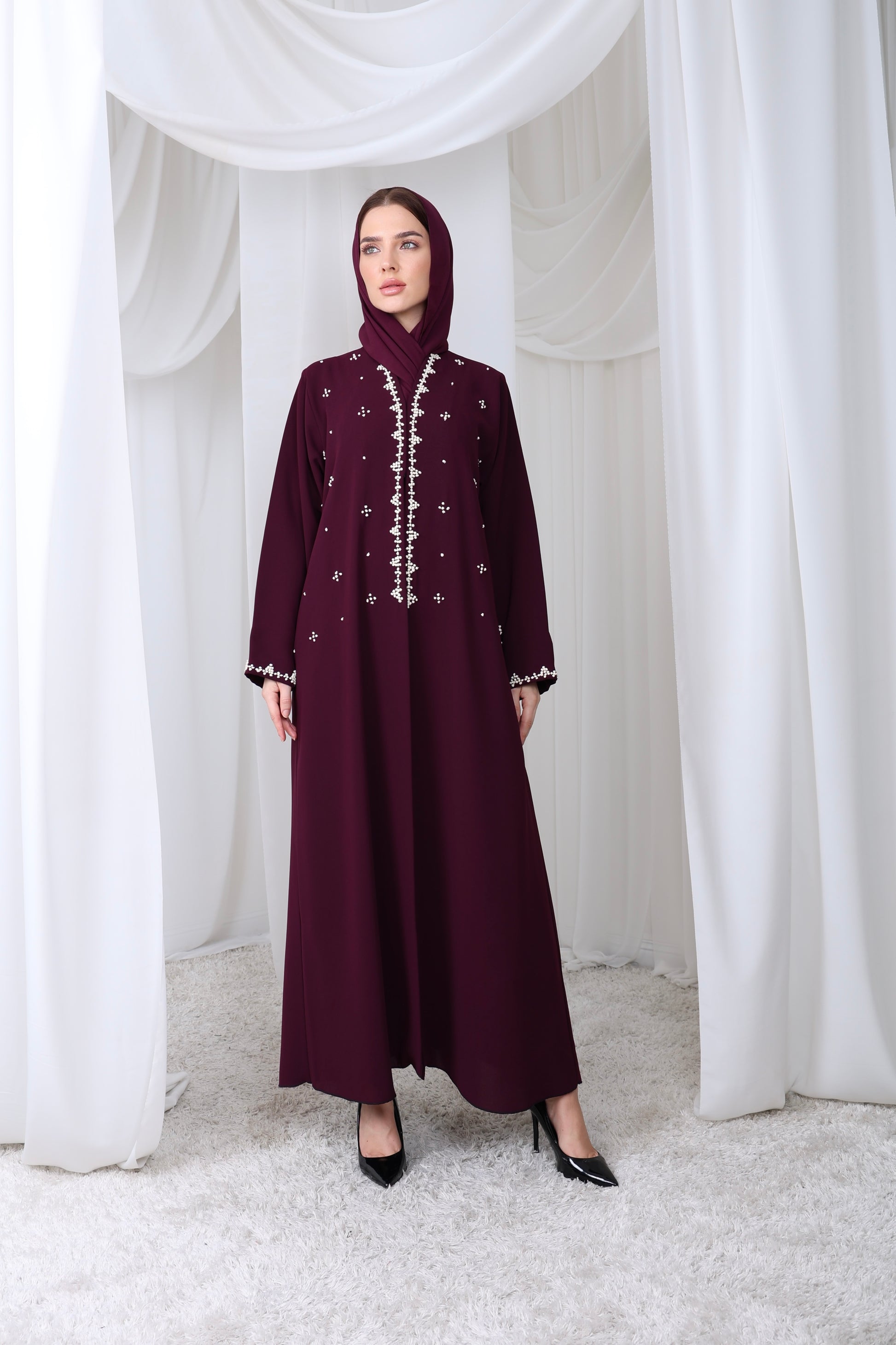 A sophisticated deep violet abaya adorned with delicate white 3D raised hand embroider cascading along the front and cuffs.